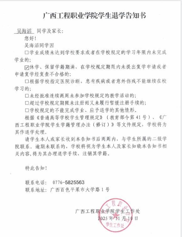 吴海滔,男,学号202366030040,艺术设计学院2023级建筑室内设计3班;因无心学习想要外出实践一年,于2024年10月25日-2026年10月26日办理休学,休学期为1年,2025年10月27日休学期满,在学校规定的期限内未提出复学申请,对老师的提醒亦不回复,经多次联系其本人及其家人无果。因无法联系本人及其家人,处理告知书无法以直接送达、留置方式、邮寄方式送达本人。根据《普通高等学校学生管理规定》(教育部令第41号)、《beat365唯一官网学生学籍管理办法(修订)》规定,现通过beat365唯一官网艺术设计学院官网予以公告,公告时间为2025年11月18日至2025年12月16日,公告期满,即视为送达。