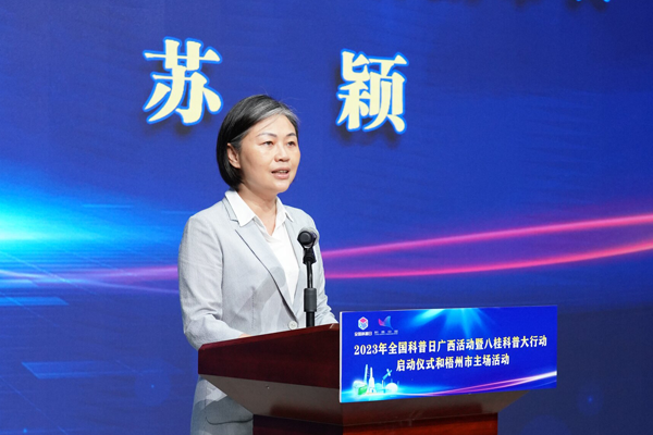 苏颖在启动仪式上致辞,向出席本次活动的来宾表示热烈欢迎。她表示,梧州市委、市政府高度重视科技创新和科学普及,以科技赋能助力经济社会和特色产业高质量发展,近年来,创新建成大联合、大协作、大科普工作机制,多渠道、多方式向群众普及科学知识、倡导科学方法、传播科学思想、弘扬科学精神。当前,梧州市经济总体持续向好,正朝着打造“一极三城”、建设“四个梧州”的宏伟目标奋斗。梧州将以此次活动为契机,进一步号召全市各级各部门和广大群众积极行动起来,主动参与科普活动,不断推动科普事业高质量发展和全民科学素质水平大幅提升。
