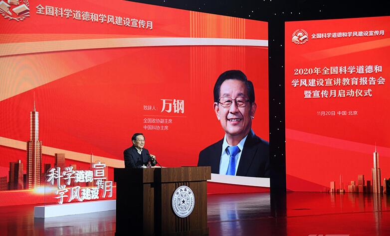 今年是科学道德和学风建设宣讲教育工作开展十周年,活动开始以视频方式回顾了历届报告会的精彩瞬间,重温了一批德学双馨的科学家的感人故事。万钢在报告会上宣布宣传月启动,并与戚发轫院士、樊锦诗先生等一同为在京青年学生赠书,引导广大师生和科研人员更加深刻体会科学家精神、更好弘扬传承优良学风。怀进鹏在主持时强调,为更好学习贯彻党的十九届五中全会精神,全国宣讲教育领导小组决定将以往的“一场报告会”,拓展为“学风建设宣传月”。宣传月活动期间,全国宣讲教育领导小组将指导各地各高校共同开展“共和国的脊梁——科学大师名校宣传工程”2020年演出季、学风传承系列活动、“最美科技工作者进校园、进院所”、院士传记赠书等系列活动,引领广大师生和科技工作者以习近平新时代中国特色社会主义思想为指引,以前辈专家学者为榜样,大力弘扬科学家精神,坚守科研诚信底线,严格自律,坚决抵制浮夸浮躁之风,自觉肩负起历史赋予的重任,在全社会营造尊重知识、崇尚创新、尊重人才、热爱科学、献身科学的浓厚氛围,为科技自立自强和建设世界科技强国汇聚磅礴力量。