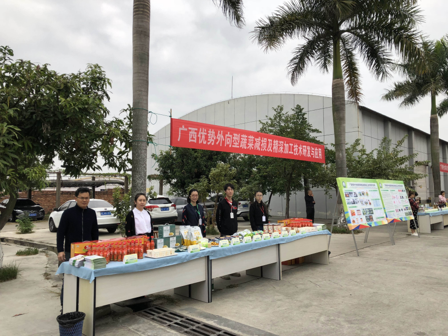 ▲辛明(中)在第三届中国(广西)—东盟农业科技交流合作研讨会(成果展示会)展示胡萝卜采后商品化处理、梯次深加工利用技术成果产品