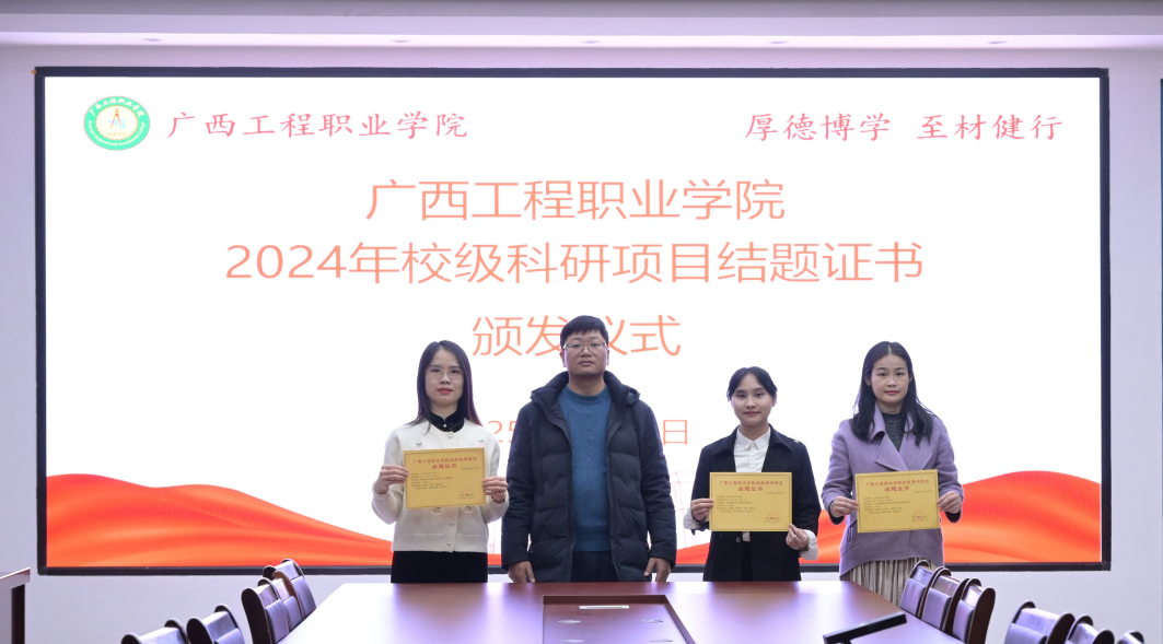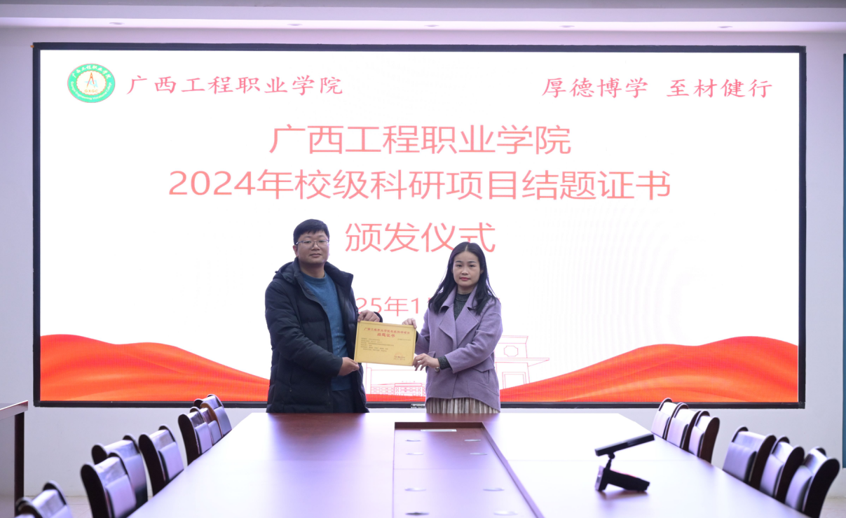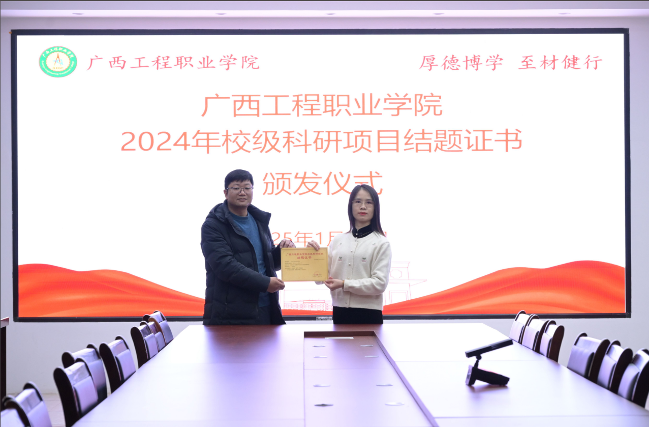 2025年1月15日,2024年校级科研项目结题证书颁发仪式在图书馆大数据中心举行,科研处科长蓝桂敏为上述3个项目颁发了结题证书,并给予各项目组深切的勉励,希望他们继续发扬刻苦钻研精神,深耕教坛,潜心研究,再接再厉,在教学和科研的道路上以更优异的成绩为区域经济建设和学校高质量发展贡献力量。
