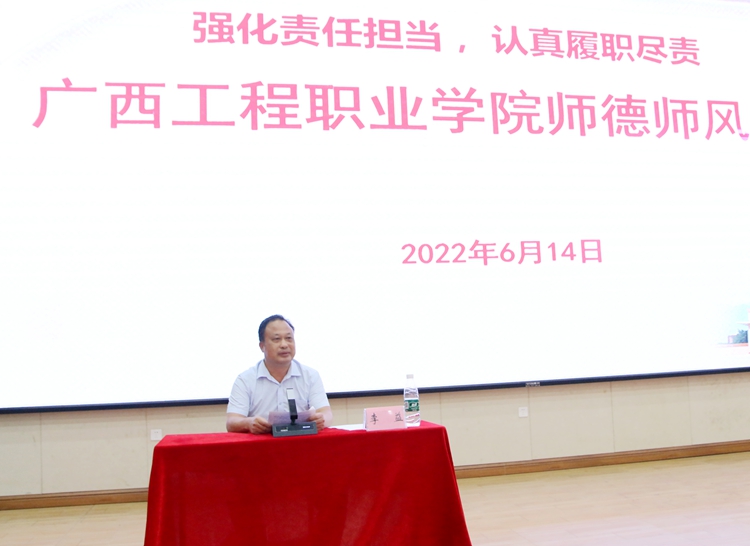 为进一步推进学校师德师风建设,落实立德树人根本任务,着力建设一支政治素质过硬、作风优良、品德高尚、能力过硬的教师队伍,6月14日下午,beat365唯一官网“强化责任担当 认真履职尽责”师德师风培训会在图文信息大楼学术报告厅举行。纪委书记、副校长彭高彬作了题为《坚持立德树人 做四有好老师》的专题培训。学校党政领导班子出席培训会,全体教职工参会,会议由党委副书记黄秋霞主持。