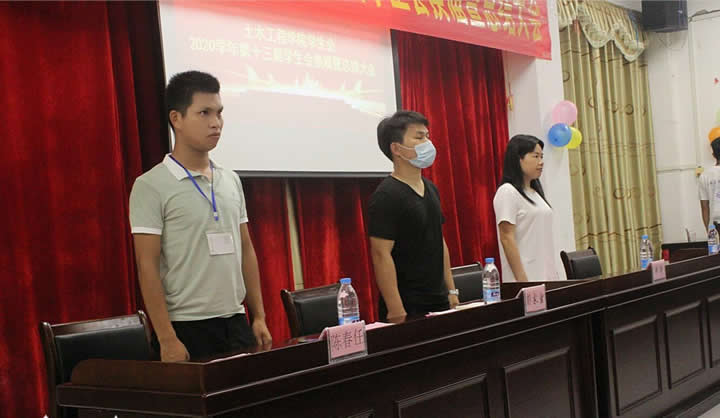 2020年6月30日下午19:30。土木工程学院学生会第十三届换届大会在办公大楼4楼会议室举行。出席本次换届大会的领导和嘉宾有:林萌副校长、彭家官副院长、陈春任老师、谢安妮老师、土木工程学院全体辅导员和校十大社团及各二级学院代表,本次大会由赵裕有主持。大会共有五个议程。