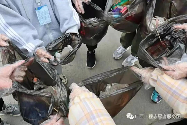 活动中,同学们不怕脏,不怕累,拾起街道上、绿化带中的白色塑料、纸屑、果皮、烟头等,最后将垃圾分类,放置对应的垃圾箱中。