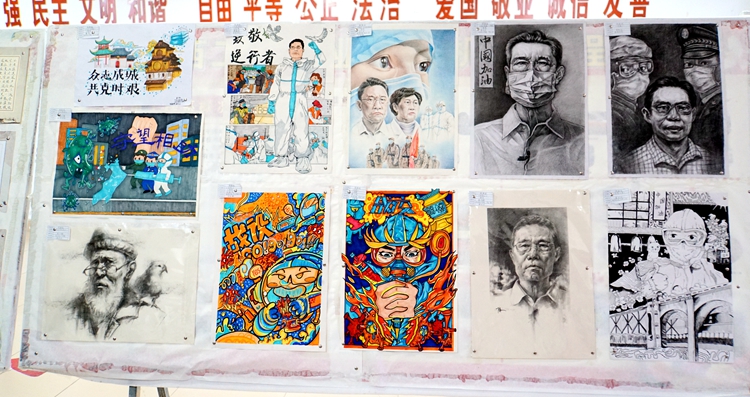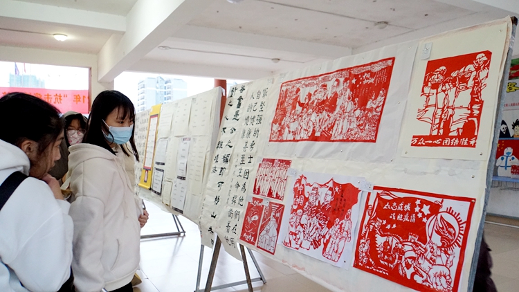 此次参展作品主题鲜明,内涵丰富,形式多样,分别展出书法、手工剪纸、绘画等作品,吸引众多的师生前来观看。工程学子们用不同形式的艺术作品致敬英雄、鼓舞斗志,表达了广大青年学生的赤子之心、爱国之情。