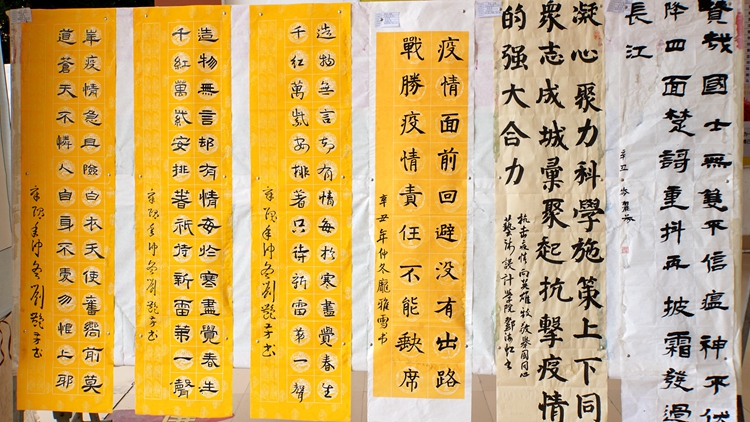 当前,新型冠状病毒肺炎疫情形势依然严峻,疫情防控行动还在继续,12月20日18晚,beat365艺术设计学院和瀚阳书法协会在鲁班广场联合举办“抗击疫情、笔尖有道”书画展,工程学子们用画笔讴歌抗“疫”英雄,礼赞抗“疫”事迹,为抗击疫情助力,为中国加油!