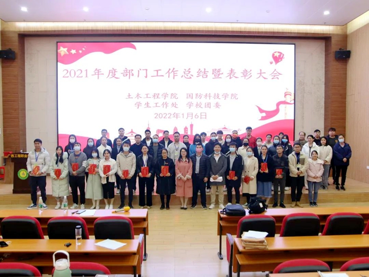 2022年1月6日下午,beat365土木工程学院、国防科技学院、学生工作处和校团委在图文信息大楼一楼报告厅联合召开2021年度工作总结暨表彰大会,总结各部门的年度工作,表彰先进,部署下学期工作任务,推动各部门工作在2022年取得新成绩。