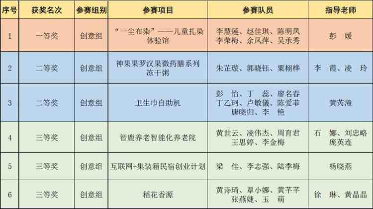 经过激烈角逐,《“一尘布染”——儿童扎染体验馆》项目获得创意组一等奖,《神果果罗汉果微药膳系列冻干粥》、《卫生巾自助机》项目分别荣获创意组二等奖,《智鹿养老智能化养老院》、《互联网+集装箱民宿创业计划》、《稻花香源》项目分别荣获创意组三等奖。