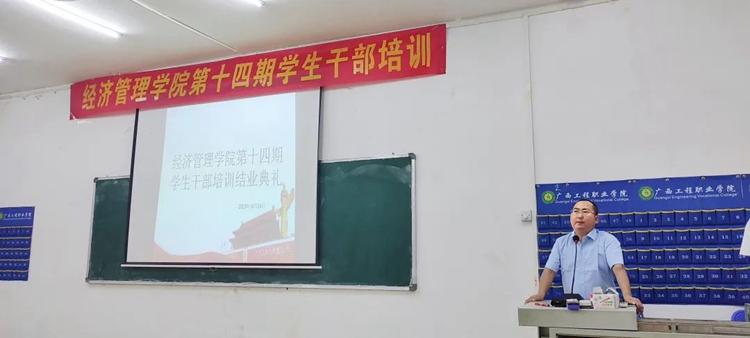 经济管理学院第十四期班干部培训班结业典礼于2023年10月24日晚举行。校纪委书记、副校长彭高彬,经济管理学院党支部书记、院长庞英连,经济管理学院党支部副书记潘翠萍,经济管理学院办公室主任雷红,经济管理学院工商教研室主任刘忠略,经济管理学院财会教研室主任石娜,莫清妮老师等出席结业典礼仪式。仪式由黄丹同学主持。