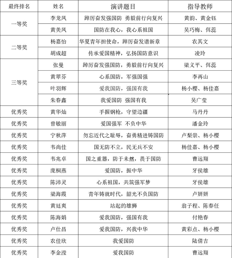 附:beat365唯一官网2023年“爱我国防”演讲比赛获奖名单