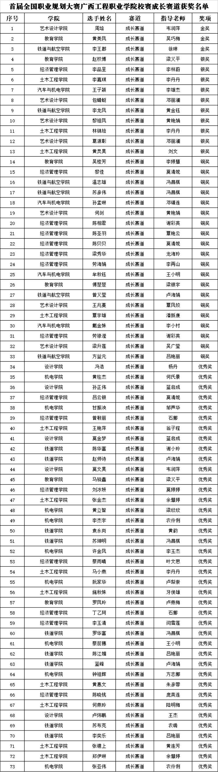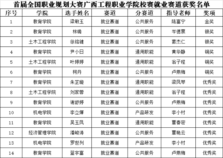 经过激烈角逐,最终就业赛道产生金奖1名,银奖2名,铜奖3名;成长赛道产生金奖3名,银奖10名,铜奖20名;其它优秀奖共48名。成长赛道金奖由艺术设计学院周培同学、教育学院黄美凤同学、铁道与航空学院李王郡同学获得;就业赛道金奖由教育学院梁敏玉同学获得。