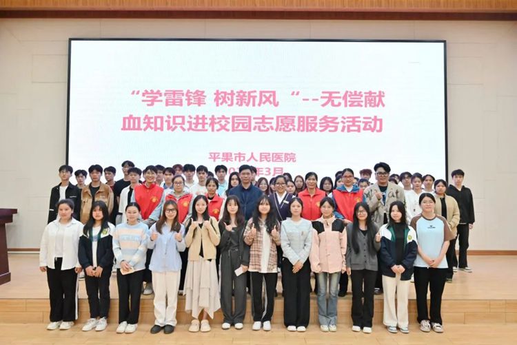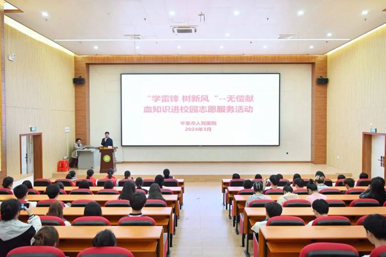 平果市输血科主任黄世俊主任作《“学雷锋 树新风“——无偿献血知识进校园志愿服务活动》专题讲座。在讲座中,他重点介绍了无偿献血的定义、发展史、重要性、益处以及临床用血的概况等内容,通过直观的方式,讲座向听众展示了无偿献血的科学性和益处,使大家对献血的知识有了更正确、更深刻的了解和认识,有助于提高公众对无偿献血的认知,促进社会对无偿献血事业的支持和参与。