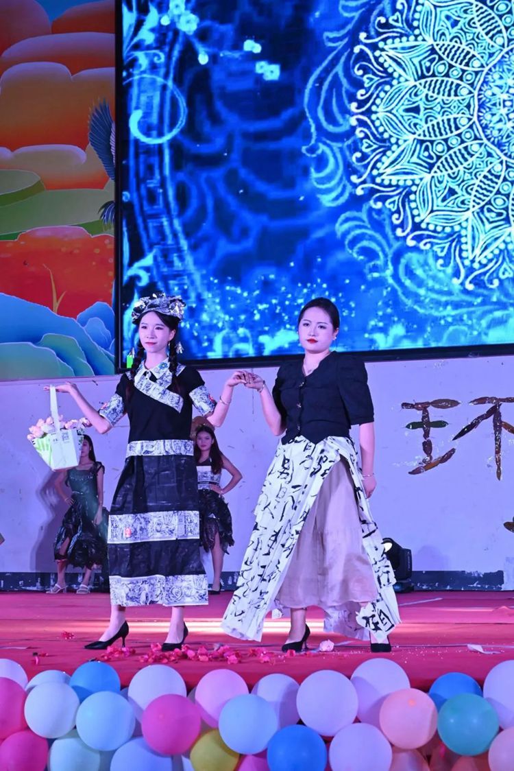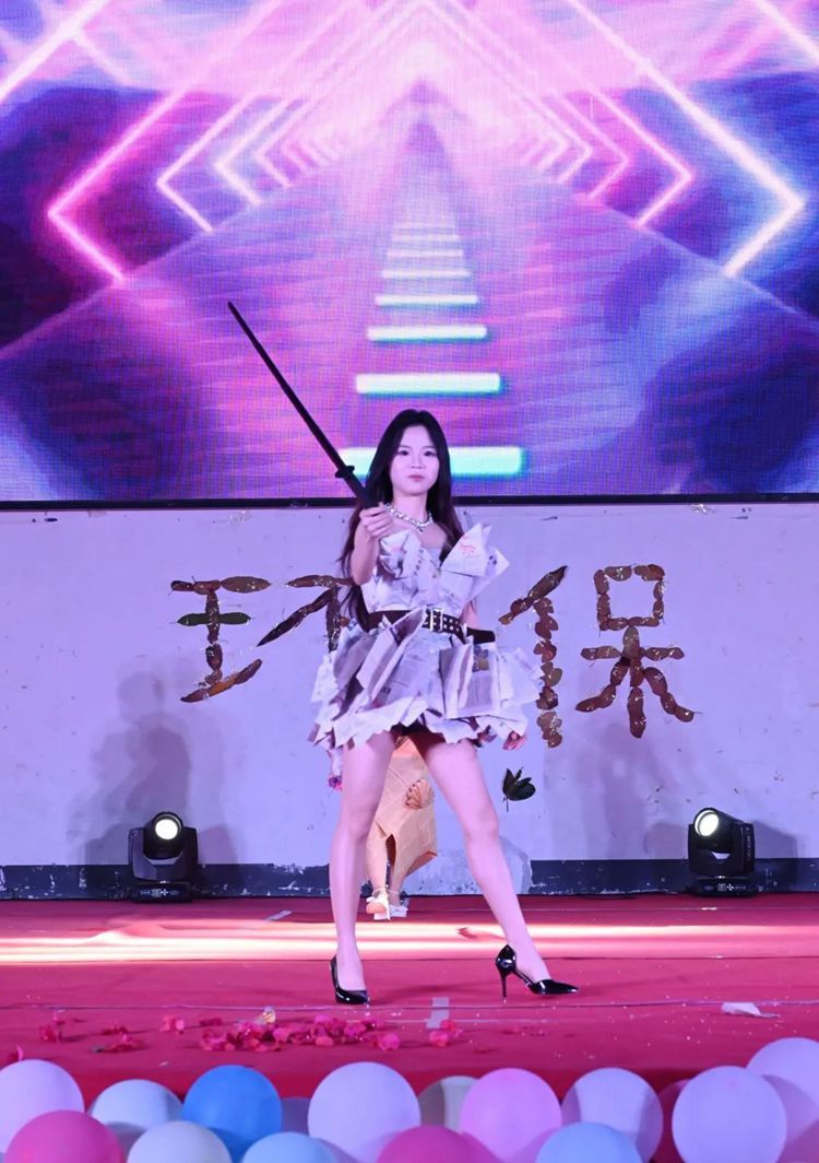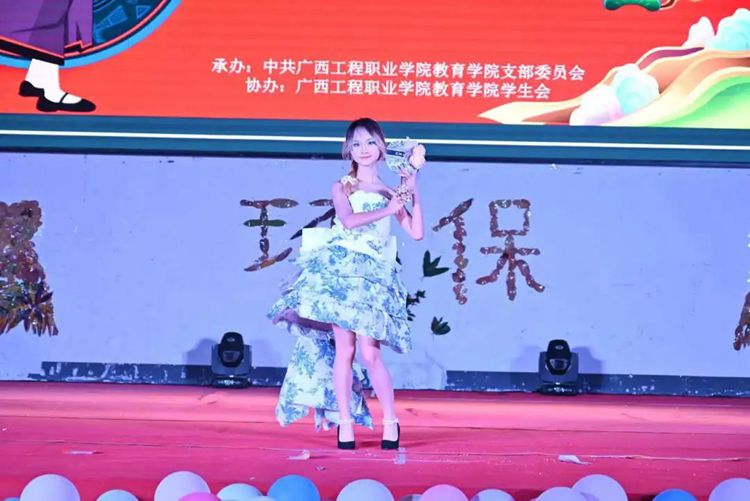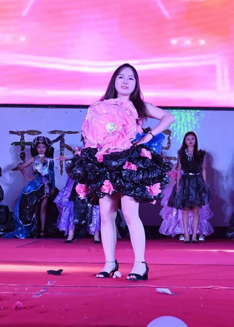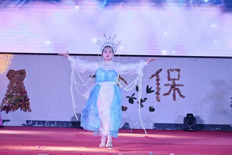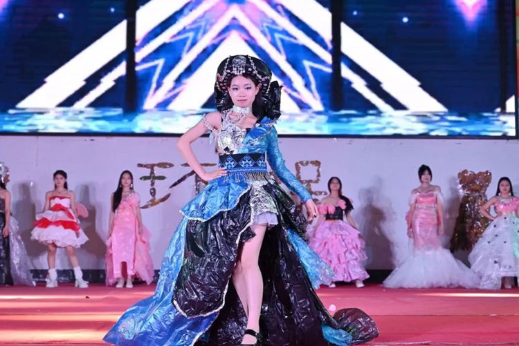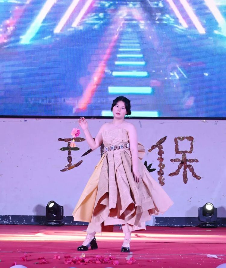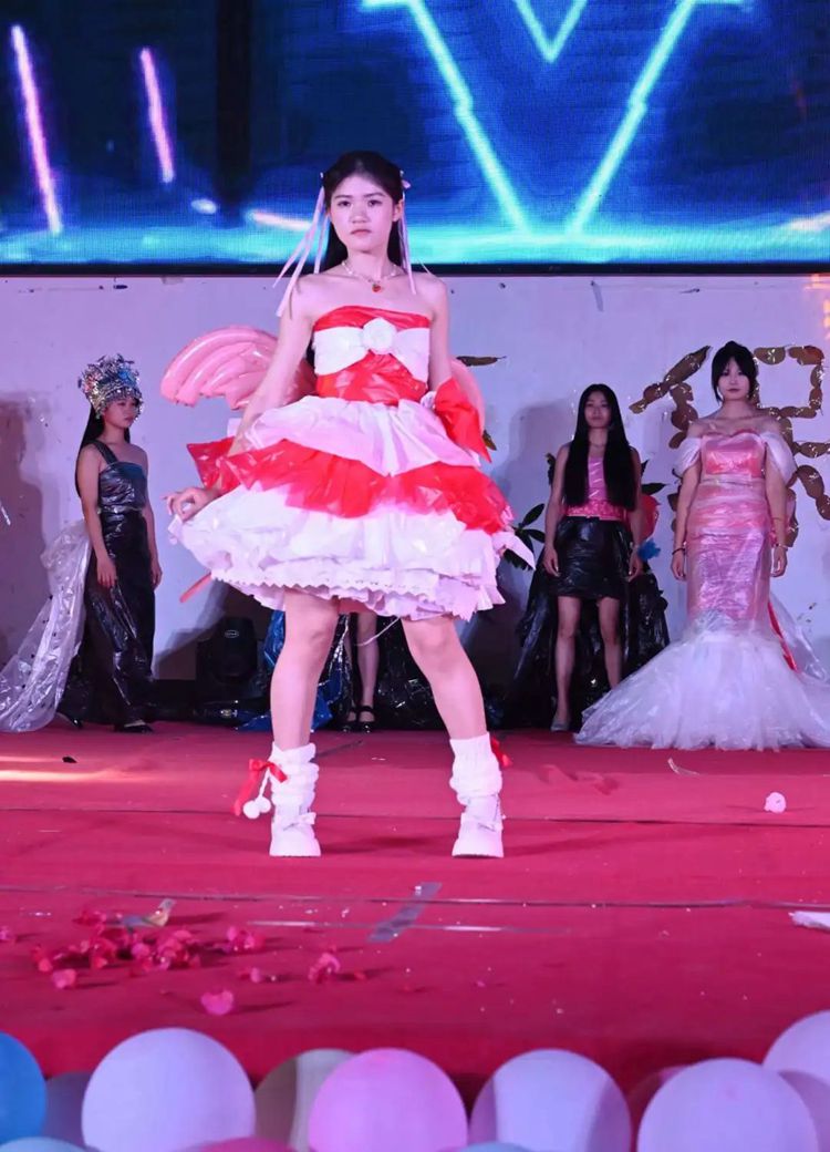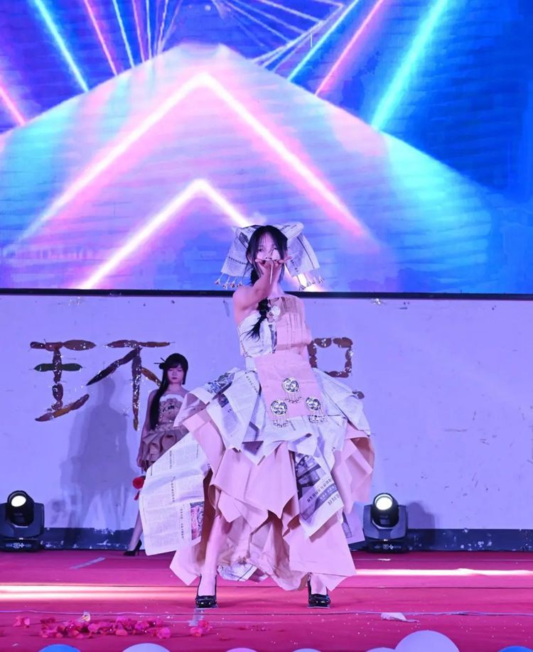 选手们热情高涨,充分发挥想象力和创造力,将塑料袋、废报纸等废弃物转化为时尚的服装作品,并依次进场完成走秀与作品展示。