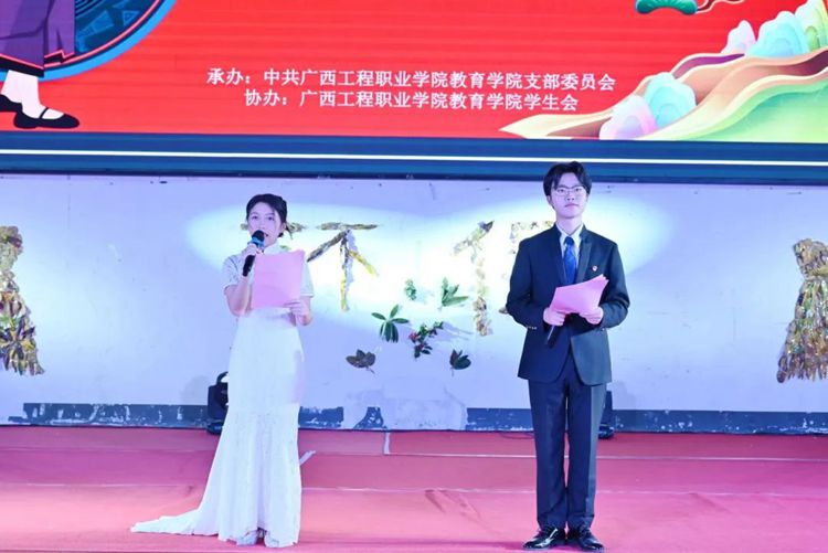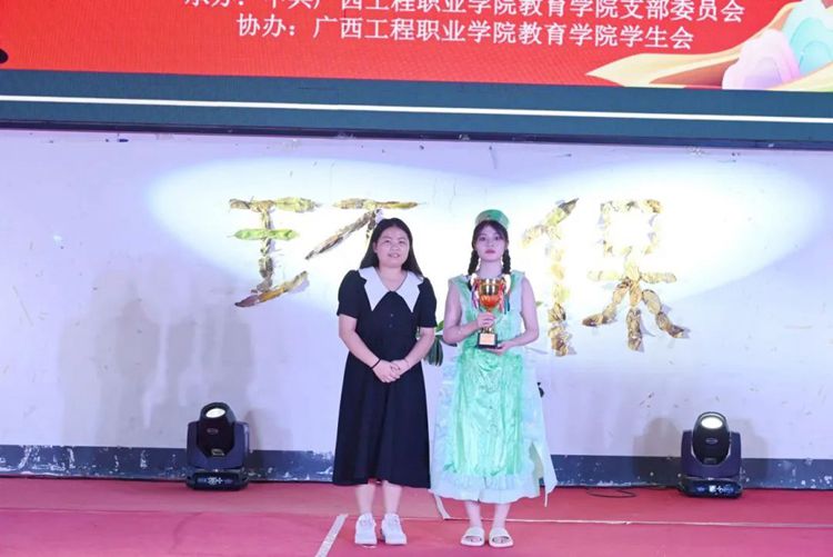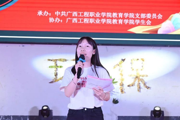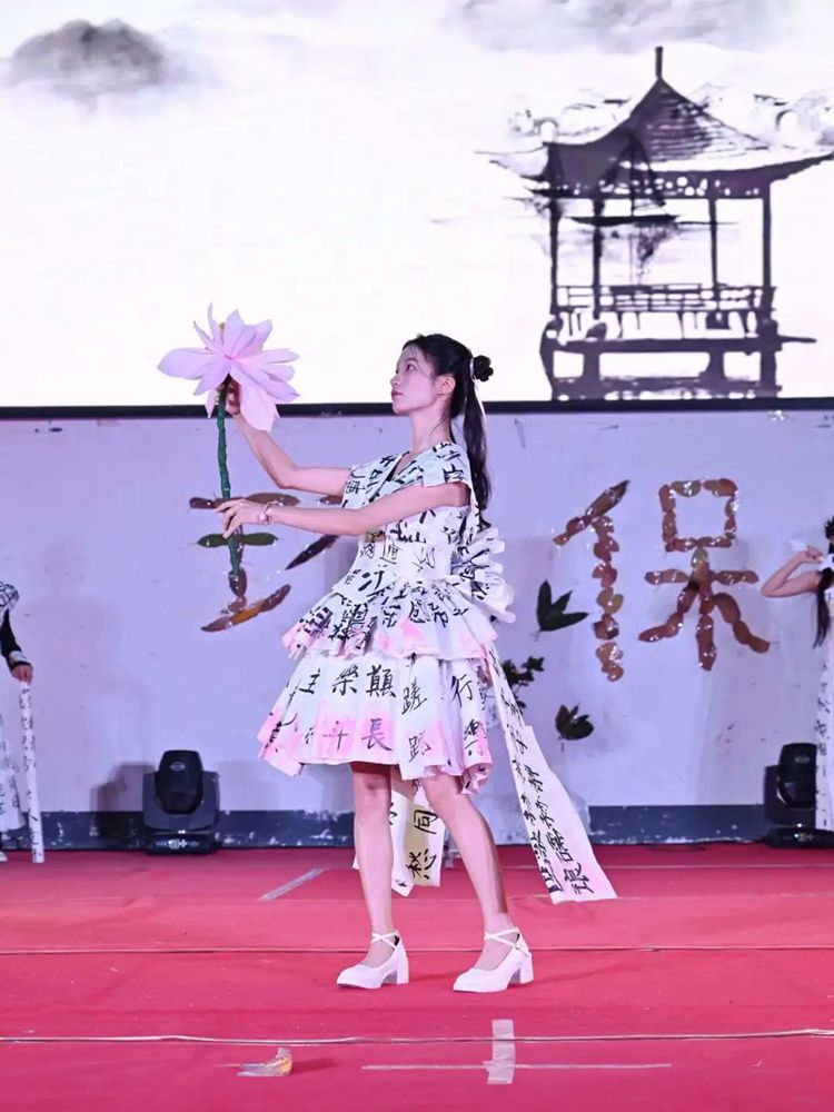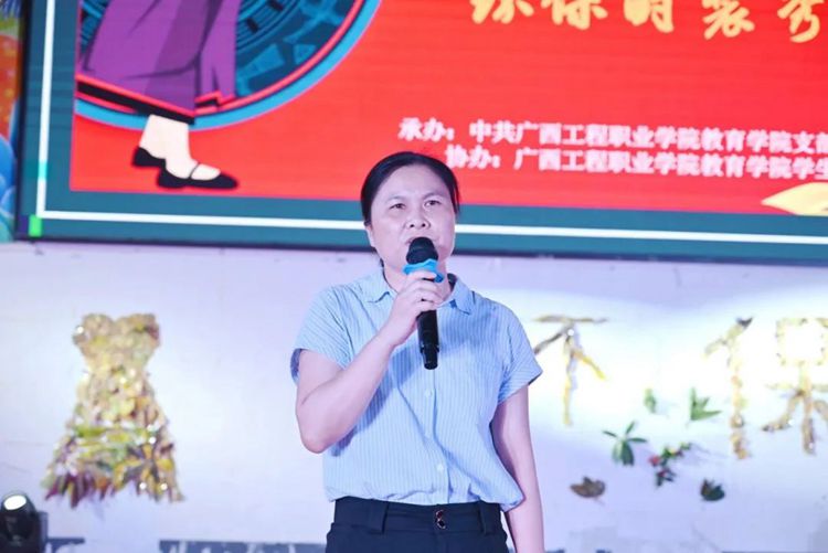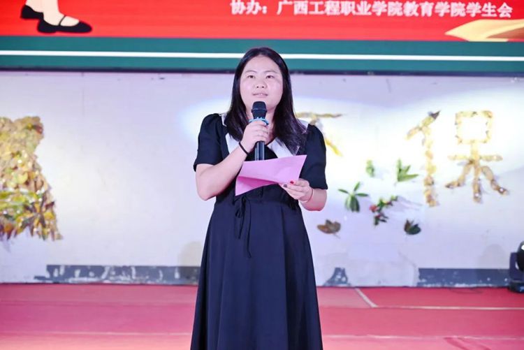教育学院党支部副书记卢燕梅致辞,她指出,本次环保时装秀旨在增强当代大学生的环保意识,展示大学生的动手能力和艺术风采,展现当代大学生健康、活泼、创新的精神风貌,积极推动校园文化建设。她坚信,同学们大胆创新的服装设计一定会给大家带来出其不意的惊喜,希望同学们把奇思妙想穿在身上,把优雅风姿展现在T台上,把聪慧睿智展露在笑脸上。