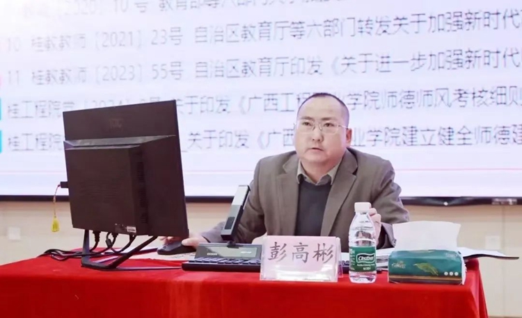 纪委书记、副校长彭高彬作题为《师德师风警示教育》的专题培训。他主要从新时代的师德师风建设、违反师德师风的具体表现、违反师德师风的典型案例、典型案例的警示教育意义和做“四有”好老师当育人大先生这五个方面进行培训,强调全体教师一要严格遵守《新时代高校教师职业行为十项准则》,牢固树立底线意识,切实增强遵守师德准则的思想觉悟和行动自觉;二要不断提高自身的专业素养和师德修养,争做“四有”好老师,当育人大先生,切实担负起为党育人、为国育才的使命;三要以案为鉴,汲取教训,警钟长鸣,始终坚守教师的职业道德规范,严守师德底线,绝不触碰“红线”,坚决杜绝出现任何师德失范行为。