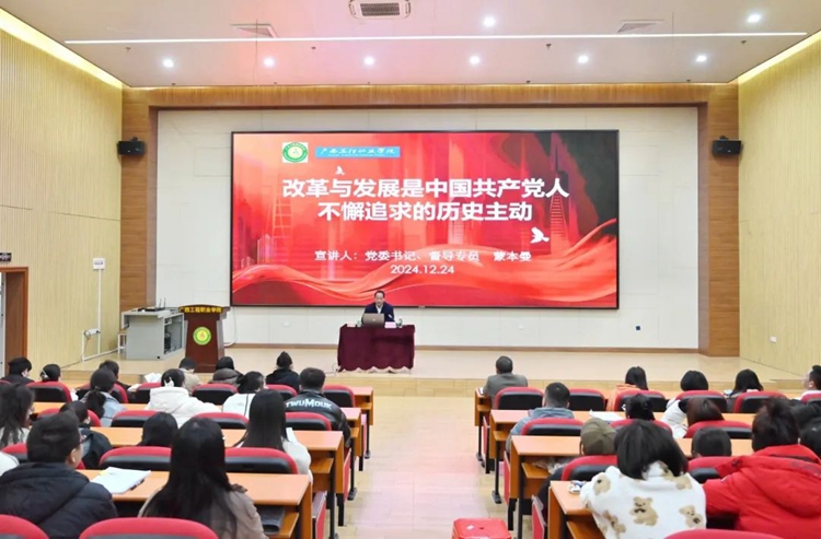 党委书记、督导专员蒙本曼作题为《改革与发展是中国共产党人不懈追求的历史主动》的专题培训,深刻阐述了“改革具有举旗定向的里程碑意义”“发展是改革的落脚点和必由之路”和“改革与发展当并驾齐驱相辅相成”三部分内容。他要求全体教师要把历史主动精神融入新时代立德树人全过程,解放思想、深化改革、强化使命担当,大力弘扬教育家精神,不断提高师德修养,努力成为“大先生”,当好引路人,以钉钉子精神推动学校各项教育改革举措落地生根、开花结果,培养更多适应新质生产力要求的创新型技术技能型人才,为全面建成社会主义现代化强国、实现第二个百年奋斗目标,以中国式现代化全面推进中华民族伟大复兴作出广工程院人的新贡献。