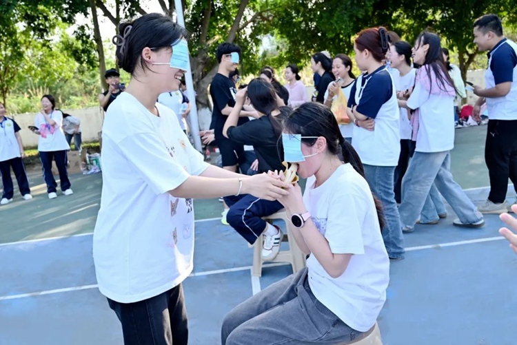 蒙眼吃香蕉的游戏吸引众多人员参与,活动区域早早便围满了跃跃欲试的师生。游戏规则简洁而充满悬念:参与者需蒙上眼罩,在队友的语言指引下,找到指定位置的香蕉,完成剥皮并吃完,用时最短者获胜。蒙眼吃香蕉项目不仅是一场趣味游戏,更是一次信任与默契的考验。指引者需要保持冷静,用清晰准确的语言为蒙眼的队友指明方向;而挑战者则要克服内心的不安,完全信任队友的指引。在这个过程中,每一次成功的配合都让参与者感受到了团队的温暖,每一次意外的状况也都成为了欢乐的源泉。
