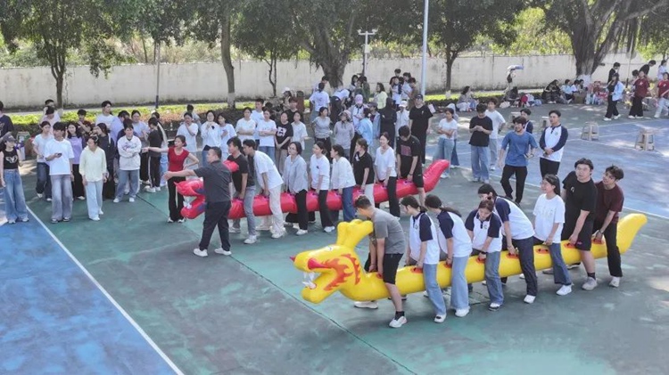 首先登场的是旱地龙舟项目。参赛队员们两两并排,队员跨坐龙舟两侧,双手提拉龙舟把手在特制的“龙舟”道具上,齐心协力喊着口号,步伐一致地向前迈进。“一二一,一二一”,整齐有力的口号声响彻篮球场。活动竞争激烈,大家都奋勇向前。有的小组配合默契,犹如离弦之箭飞速前进;有的小组在途中虽出现一些小状况,但队员们迅速调整状态,相互鼓励,不气馁不放弃,坚持完成比赛。该项目充分考验了团队的协作能力和默契程度,让师生们深刻体会到团结的力量,在比赛中不仅收获了快乐,更收获了团队的凝聚力。