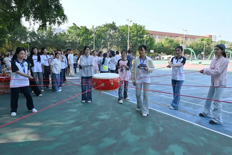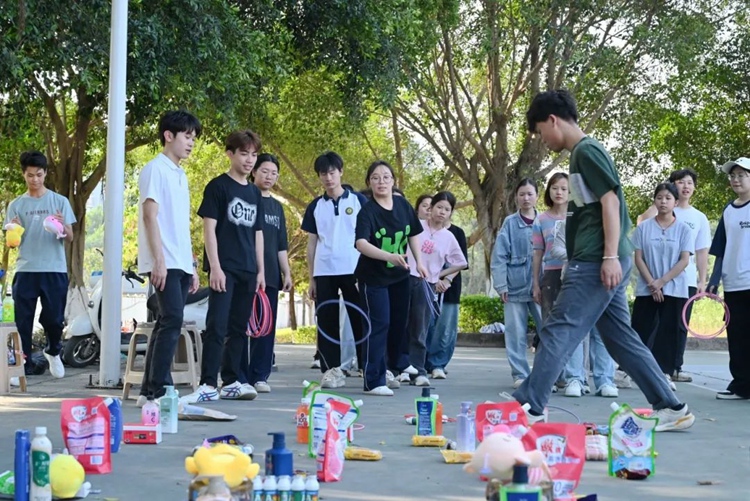 除了旱地龙舟、击鼓传花这两个传统的集体竞赛项目,新增的“好运套圈圈”环节备受欢迎。师生们手持圈圈,站在指定区域,目光专注地瞄准前方摆放的各类精美奖品。老师和同学们有的技巧娴熟,轻轻一抛,圈圈便稳稳地套中了心仪的奖品;有的则稍显生疏,但在不断尝试中也逐渐掌握了诀窍。现场不时传来成功套中奖品的欢呼声,大家脸上都洋溢着开心的笑容。套圈圈项目充满了趣味性和互动性,让师生们在游戏中放松身心,享受成功带来的喜悦。