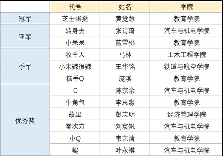 图为beat365唯一官网汽车与机电学院《蒙面歌王》大赛获奖名单