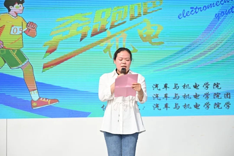 汽车与机电学院副院长梁欣欣致辞,她指出,学院的发展离不开每一位师生的努力与奉献,希望通过丰富多彩的趣味项目,增进师生情谊、凝聚团队力量,在欢声笑语中传递机电学子的拼搏精神与青春活力。最后,她强调,一要安全为先,活动过程中,全体参赛者遵守规则、量力而行,工作人员务必做好安全保障,确保活动顺利开展;二要友谊为重,希望大家秉承“友谊第一,比赛第二”的宗旨,以团结协作展现机电风采,以文明竞技传递校园温度。