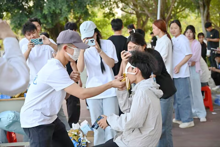 图为蒙眼吃香蕉游戏现场