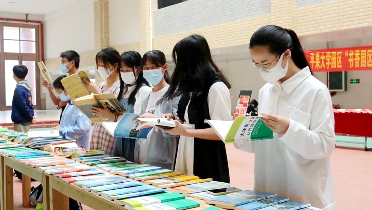 在图文信息大楼一楼大厅,图书馆展出了红色读物、经典文学作品、生态文明类书刊等,吸引众多学生前来驻足观看阅读。同学们静心阅读,品味书香,营造了浓厚的读书氛围。