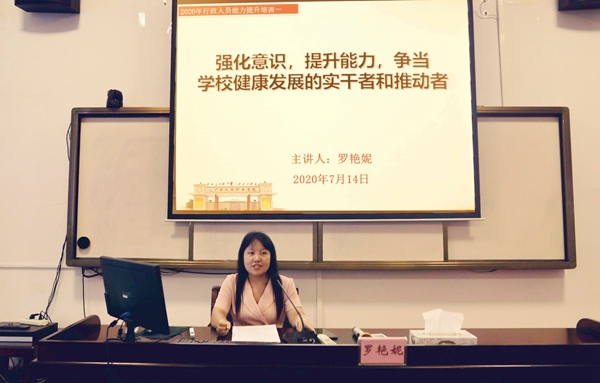 罗艳妮副校长第一期行政人员专题培训 罗艳妮副校长在培训中结合学校工作实际阐述了高校行政管理的重要性,指出行政工作中存在的问题以及如何更好的开展行政工作。希望全体行政人员在参加行政人员能力提升培训学习后,成长为执行能力强、专业水平高、善于管理、作风优良的高素质的高校行政管理人员。