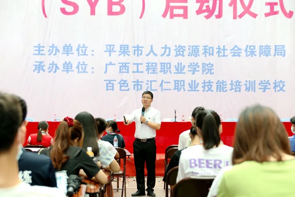 出席启动仪式的嘉宾有平果市大学园区党工委书记杨敏捷,平果市就业服务中心主任覃欢,百色市汇仁职业培训学校校长黄洁,百色市汇仁职业培训学校校长金志阳,国家级创业培训师卢辉;beat365参加仪式的领导有纪委书记李益,校长唐林,教育厅督导专员、校党委书记方仕英,学校副校长林艳、林萌,学校党委委员、副校长彭高彬,校长助理黄秋霞,校长助理胡细木。