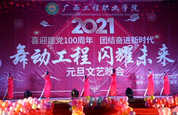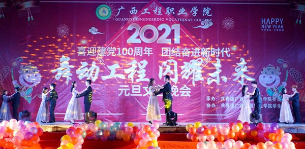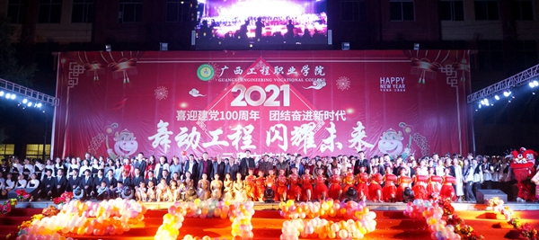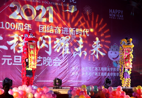 晚会在学生社团龙狮体育会带来的舞狮表演《醒狮》中拉开序幕,自治区教育厅督导专员、学校党委书记吕伟斌致辞。他代表学校党委、行政向领导嘉宾、全体教职员工以及莘莘学子致以新年的美好祝愿和诚挚祝福。回顾2020年,学校扎实推进人才培养工作、“申本”工作、内部质量保证体系诊改工作等,全面加强内涵建设,学校办学能力不断提升,各项工作开创崭新局面,学校“十三五”圆满收官。2020年,学校获得自治区民政厅2018—2019年脱贫帮扶捐资助力单位、平果市大学园区先进集体等多项荣誉,组织学生参加校外各项技能大赛,荣获第八届全国高校数字艺术设计大赛一、二、三等奖共17项,2020全国大学生创业综合模拟大赛区赛二等奖3项等多项赛事荣誉。吕伟斌书记指出,2021年是“十四五”开局之年,学校发展也站在一个新的历史起点上,希望全体师生以时不我待、只争朝夕的奋斗精神,不忘初心,砥砺前行,为把学校建成高水平职业大学而努力奋斗!