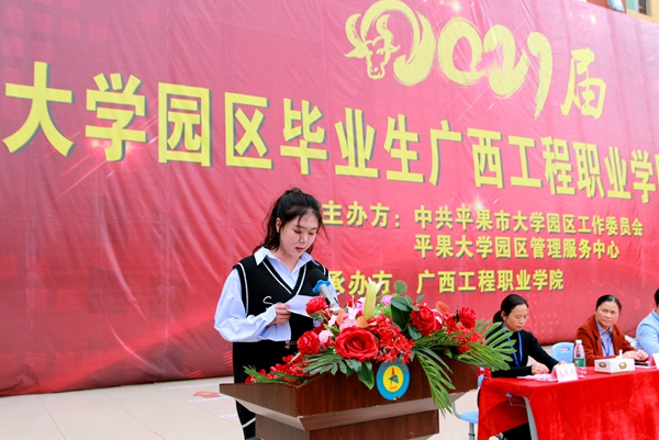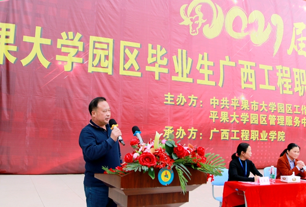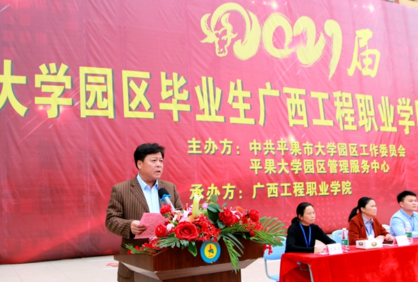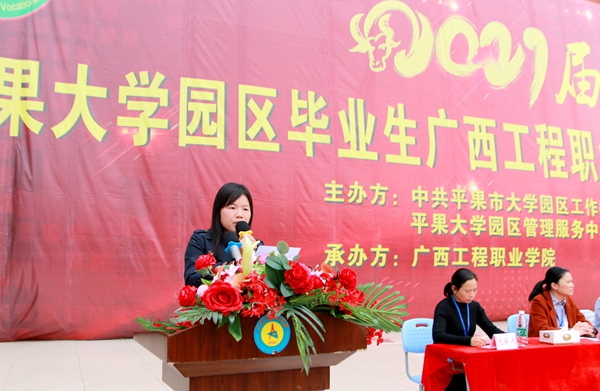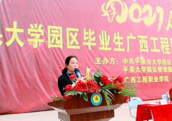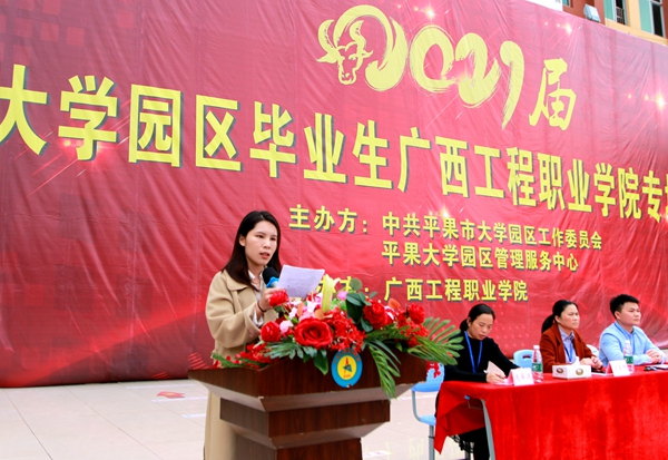 平果市大学园区党工委书记杨敏捷讲话。他指出了近年来平果市大学园区管理服务中心在推动园区毕业生就业创业工作上作出的努力和取得的突出成绩,对园区各个高校培养思想道德素质高尚、专业技术过硬、职业能力强的毕业生,贡献地方经济社会发展表示感谢。今天在学校举办的第二场2021届高校毕业生人才双选会,为本园区广大毕业生的就业创业提供了良好机遇,希望用人单位广招贤士,以发展的眼光看待每一名毕业生,为毕业生提供就业的机会、成长的平台和发展的空间,积极吸纳储备人才;也希望同学们树立正确就业择业观念,抓住双选会的大好时机,谋求发展,顺利就业,在实现中国梦的实践中放飞青春梦想。