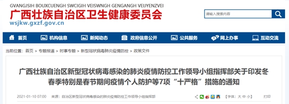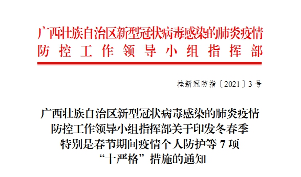 近日,自治区新型冠状病毒感染的肺炎疫情防控工作领导小组指挥部发布了关于印发冬春季特别是春节期间疫情个人防护等7项“十严格”措施的通知