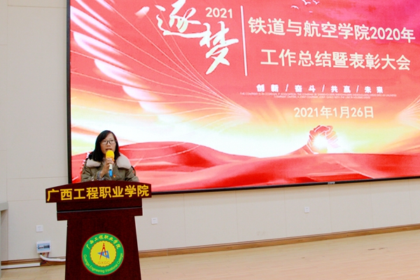 会上,覃清香副院长对铁道与航空学院2020年总体工作进行总结,她充分肯定了学院全体专兼职教师、辅导员、行政人员在教育教学、学生管理、党团建设等方面做出的努力和成绩,同时也指出了不足之处。覃清香副院长希望全体铁道与航空学院教师在新的学年要履好职责、勇担育人使命,继续努力,共同推进学院的新的教育事业取得新发展。