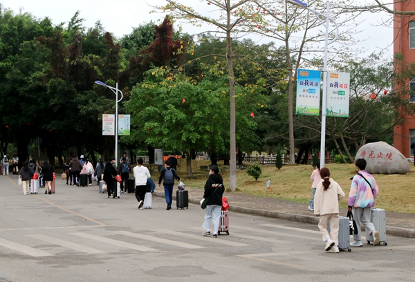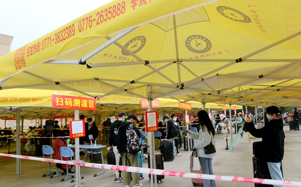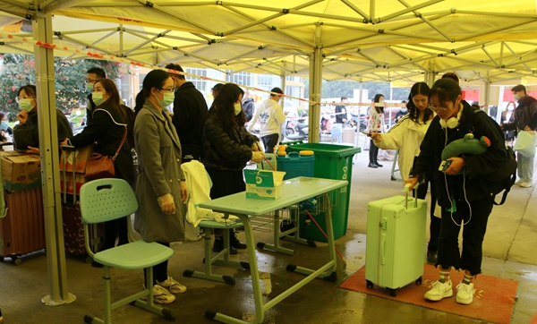 学生返校当天,学校在校门口搭建了临时帐篷,划分了“汽车停放区”“排队等候区”“扫码区”“体温测量区”“行李消杀区”“返校资料审核区”等多个区域,并开通了多条通道方便学生有序返校。学生配合疫情防控查验,有序排队,进行体温筛查,出示健康“绿码”,进行行李消杀和核验返校材料信息无误后,签到注册、上交相关材料,安全进入校园。学校还贴心安排了观光车,帮助学生运送行李至宿舍楼。
