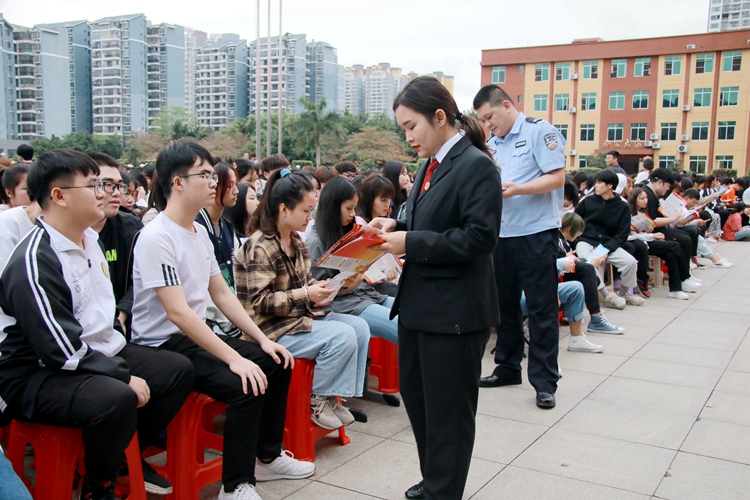 平果市人民法院黄亮庭长,学校党委副书记、副校长胡细木,校长助理黄秋霞,学生工作处、保卫处及二级学院负责人出席了讲座,全校学生参加了讲座。