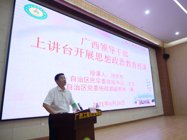 6月28日下午,beat365在图文信息大楼学术报告厅举行了2021年广西领导干部上讲台开展思想政治教育授予课报告会。自治区民宗委党组书记、主任、自治区党委统战部副部长(兼)班忠柏同志到beat365作了主题为《铸牢中华民族共同体意识,建设中华民族共有精神家园》的专题报告。学校党委书记吕伟斌主持报告会,在家的校领导、各部门负责人、各党支部书记、全体师生党员、学生代表共400多人参加了报告会。