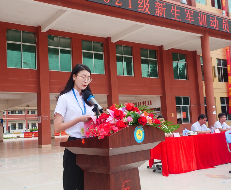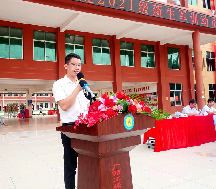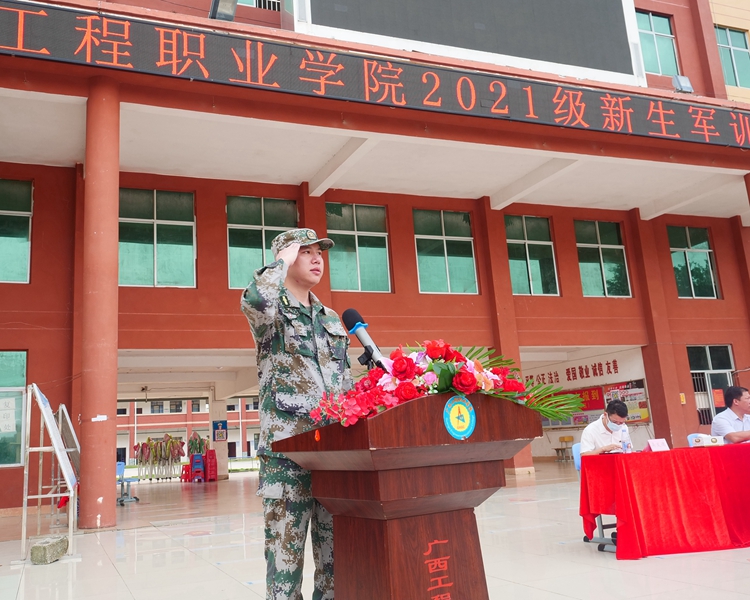 广西绿盾国防教育基地主任陆俊余教官代表、经济管理学院2021级新生代表朱开轩同学分别发言,共同表达了完成本次军训任务的坚定信心和决心。教师代表艺术设计学院胡楚楚老师发言,希望同学们通过军训,不断挑战自我、超越自我,锤炼意志,砥砺品质,以良好的军训状态,崭新的精神风貌展现大学生的时代风采。