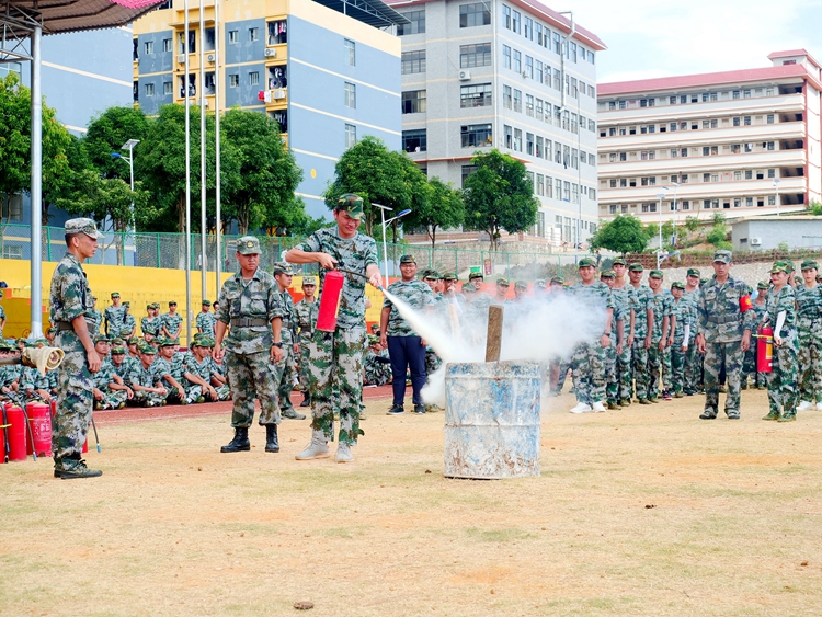 活动伊始,军训教官向同学们说明了本次演练活动的具体流程及安排,详细介绍了灭火器的几种类型并为同学们示范了打开灭火器的正确方式。随后,同学们在教官和辅导员的带领下进行灭火演练。在教官的指导下,新生们依次上前,手持灭火器喷灭火源,亲身体验灭火过程。
