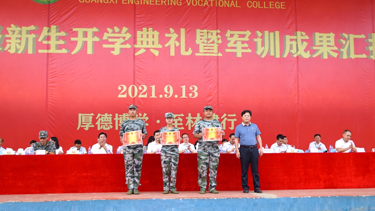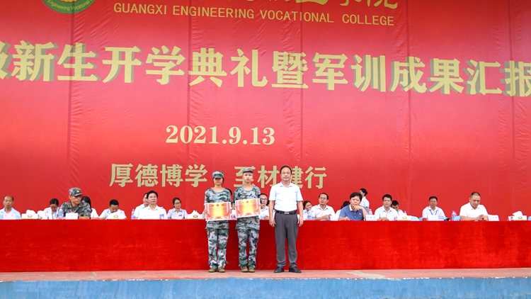 百色市人民政府督学杨敏捷为荣获军训会操表演第三名的营连代表颁奖