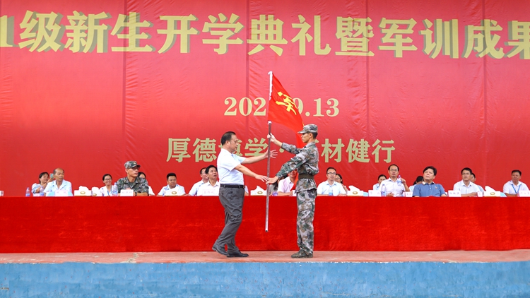 最后,广西绿盾国防教育基地总教官唐森林向学校纪委书记李益转交军训团团旗,beat365唯一官网2021级新生开学典礼暨军训成果汇报会圆满结束。