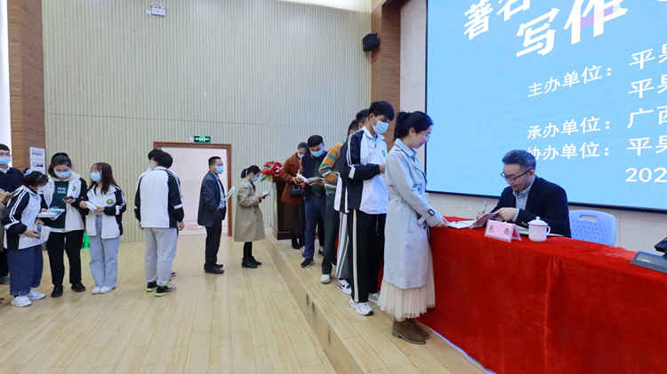 平果市作家协会会员、平果大学园区各高校文学社团及文学爱好者200余人聆听讲座。讲座由平果市委常委、宣传部部长陈丹主持。