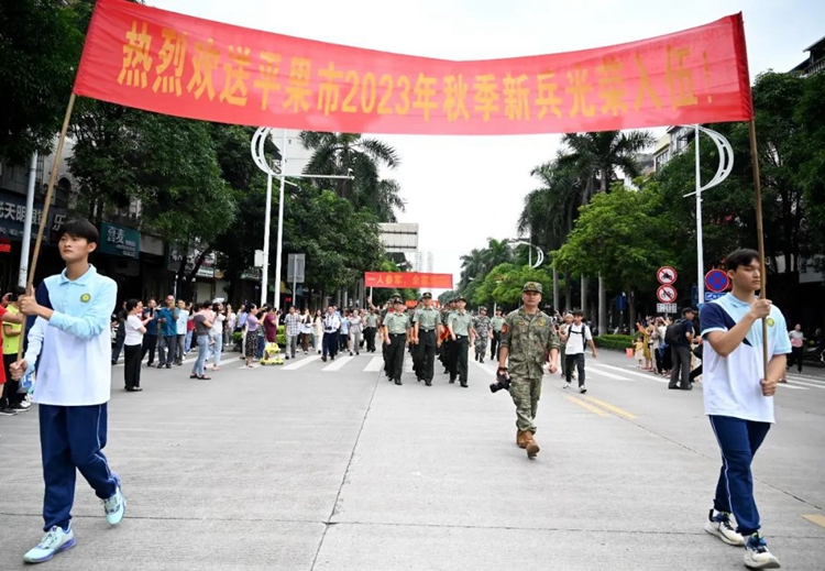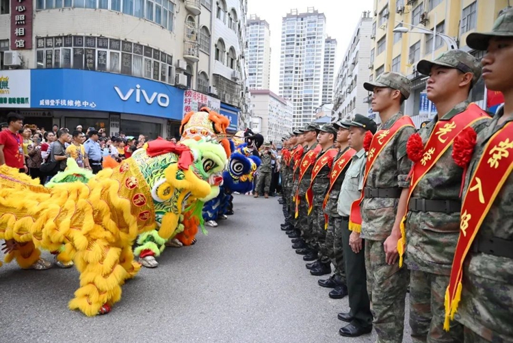 新兵着戎装佩红花绶带环街游行,沿街群众纷纷驻足拍照、点赞,为即将奔赴军营的家乡子弟致以崇高的敬意。