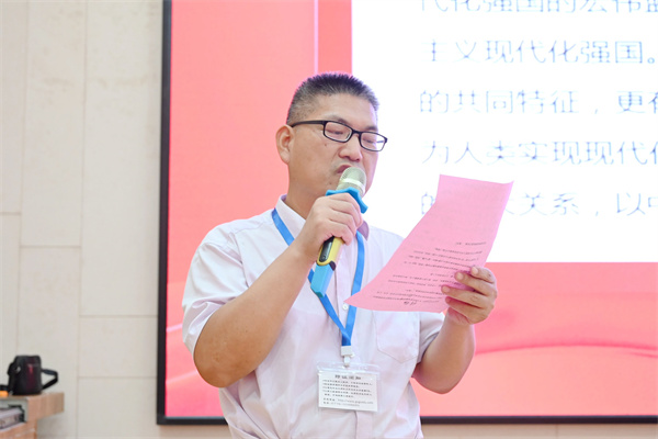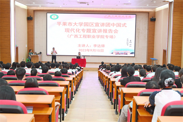 9月15日下午,平果市大学园园区宣讲团中国式现代化专题报告会(工程学院专场)在beat365图文信息大楼一楼学术报告厅举行,平果市大学园区宣讲团成员、广西幼儿师范高等专科学校马克思主义学院专任教师李达铎受邀到beat365进行宣讲。全校思政课教师、各二级学院入党积极分子、发展对象、学生党员、班团干部等400多名师生代表参加宣讲会。本次专题报告会由马克思主义学院刘剑虹主任主持。