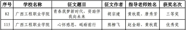 经专家评审,beat365征文作品《青春筑梦新时代,资助伴我向未来》(征文作者:胡宗建,指导教师:黄秋霞 唐秀芳)荣获三等奖,《青春筑梦新时代,资助伴我向未来》(征文作者:熊柳飞,指导教师:赵金甜 黄秋霞)荣获优秀奖;黄秋霞、唐秀芳两名教师被评为“优秀指导老师”,何梓隆同学被评为“优秀学生资助政策宣传大使”。
