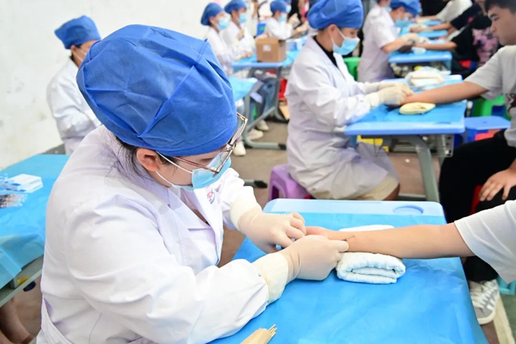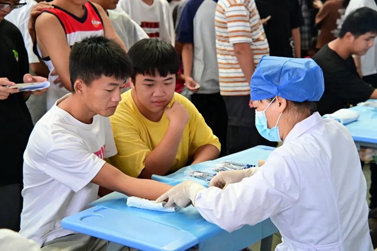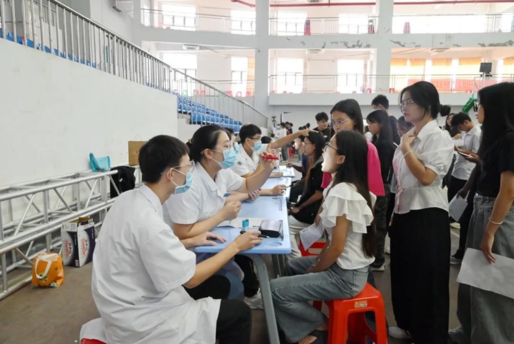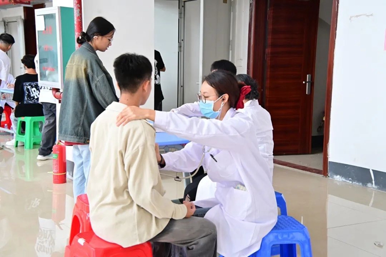 同学们在进行体检时,医护人员一丝不苟地认真开展工作,确保体检的顺利进行