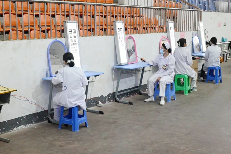 在进行体检中的视力检查时,同学们需要认真注意医生或护士的指引,依次有序地等待检查。