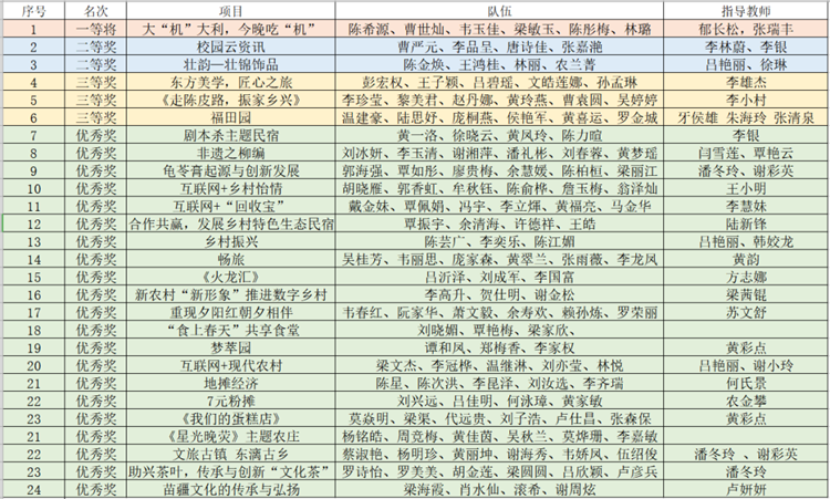 经过一系列激烈的竞争,最终《大“机”大利,今晚吃“机”》项目获得一等奖,《校园云资讯》《壮韵—壮锦饰品》项目获得二等奖,《东方美学,匠心之旅》《走陈皮路,振家乡兴》《福田园》项目获得三等奖。