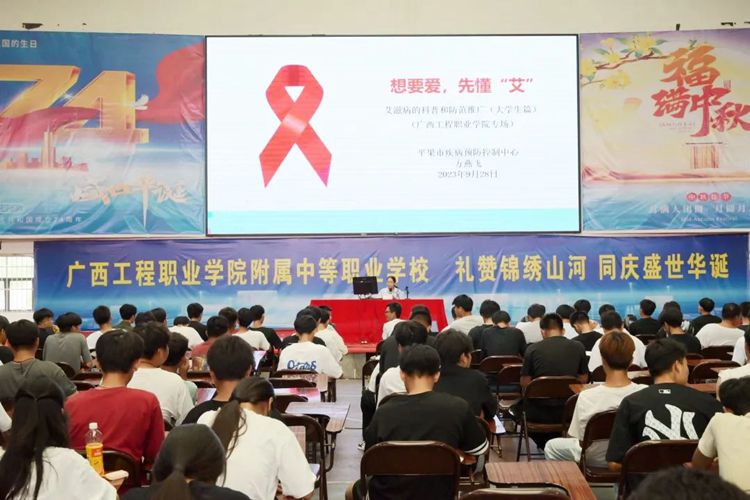 平果市疾病控制中心的方燕飞作艾滋病知识专题讲座。她主要从艾滋病的含义、传播途径以及预防措施等三个方面进行了深入的讲解,以提高同学们对艾滋病的认识,并倡导同学们关心社会、关爱艾滋病患者,珍爱自己的生命。