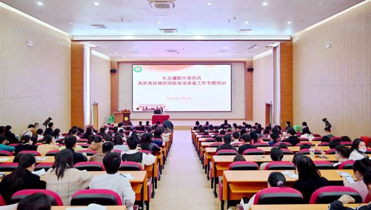 3月5日晚,学校在图文信息大楼一楼学术报告厅召开“扎实履职尽责作风 高质高效做好迎检各项准备工作”主题培训会,学校领导班子及全体教职工参加会议。会议由质量管理办公室副主任蓝桂敏主持。