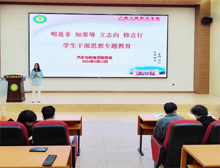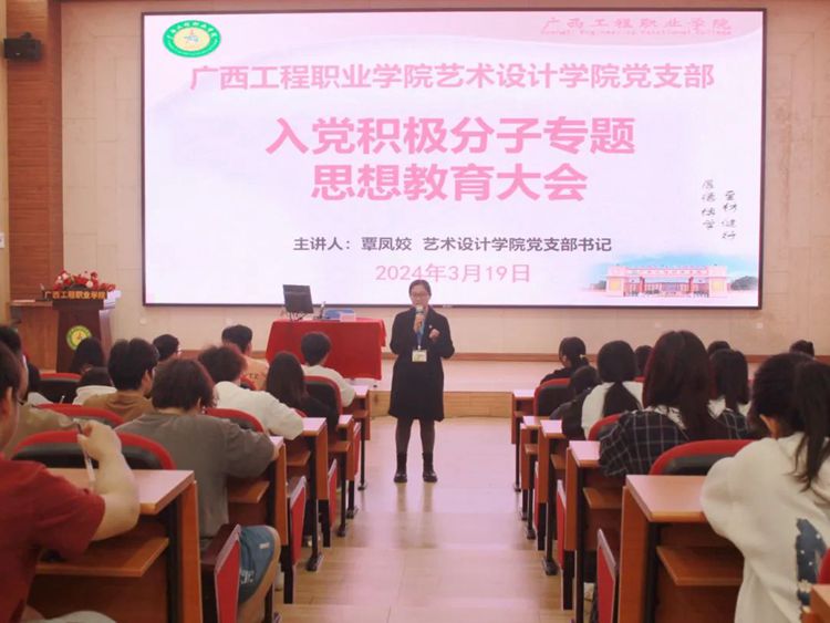 3月19日至21日,艺术设计学院开展入党积极分子专题思想教育、文明礼仪教育和学生公寓安全知识专题教育,分别由艺术设计学院党支部书记、院长覃凤姣,党支部副书记赵志辉和蓝启成老师作专题教育。